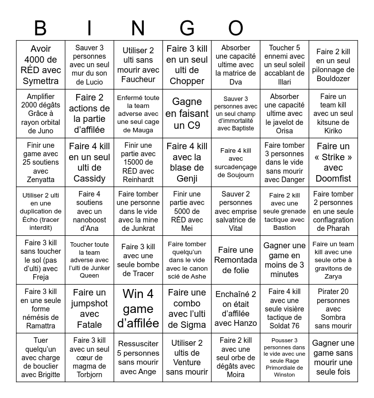 This bingo card has a free space and 48 words: Faire 3 kill sans toucher le sol (pas d’ulti) avec Freja, Faire 4 soutiens avec un nanoboost d’Ana, Ressusciter 5 personnes sans mourir avec Ange, Faire tomber quelqu’un dans le vide avec le canon scié de Ashe, Sauver 3 personnes avec un seul champ d’immortalité avec Baptiste, Faire 2 kill avec une seule grenade tactique avec Bastion, Faire 2 kill en un seul pilonnage de Bouldozer, Tuer quelqu’un avec charge de bouclier avec Brigitte, Faire 4 kill en un seul ulti de Cassidy, Faire tomber une personne dans le vide avec la mine de Junkrat, Faire 3 kill en un seul ulti de Chopper, Absorber une capacité ultime avec la matrice de Dva, Faire tomber 3 personnes dans le vide sans mourir avec Danger, Faire un « Strike » avec Doomfist, Utiliser 2 ulti en une duplication de Écho (tracer interdit), Faire un jumpshot avec Fatale, Utiliser 2 ulti sans mourir avec Faucheur, Faire 4 kill avec la blase de Genji, Enchaîné 2 on était d’affilée avec Hanzo, Toucher 5 ennemi avec un seul soleil accablant de Illari, Faire un team kill avec un seul kitsune de Kiriko, Amplifier 2000 dégâts Grâce à rayon orbital de Juno, Sauver 3 personnes avec un seul mur du son de Lucio, Enfermé toute la team adverse avec une seul cage de Mauga, Faire 2 kill avec une seul orbe de dégâts avec Moira, Absorber une capacité ultime avec le javelot de Orisa, Faire tomber 2 personnes en une seule conflagration de Pharah, Faire 3 kill en une seule forme némésis de Ramattra, Toucher toute la team adverse avec l’ulti de Junker Queen, Finir une partie avec 15000 de RÉD avec Reinhardt, Faire une combo avec l’ulti de Sigma, Faire 4 kill avec surcadençage de Soujourn, Faire 4 kill avec une seule visière tactique de Soldat 76, Pirater 20 personnes avec Sombra sans mourir, Avoir 4000 de RÉD avec Symettra, Faire 3 kill avec un seul cœur de magma de Torbjorn, Faire 3 kill avec une seule bombe de Tracer, Utiliser 2 ultis de Venture sans mourir, Sauver 2 personnes avec emprise salvatrice de Vital, Pousser 3 personnes dans le vide avec une seule Rage Primordiale de Winston, Faire un team kill avec une seule orbe à gravitons de Zarya, Finir une game avec 25 soutiens avec Zenyatta, Faire 2 actions de la partie d’affilée, Win 4 game d’affilée, Gagne en faisant un C9, Faire une Remontada de folie, Gagner une game en moins de 3 minutes and Gagner une game sans mourir une seule fois.