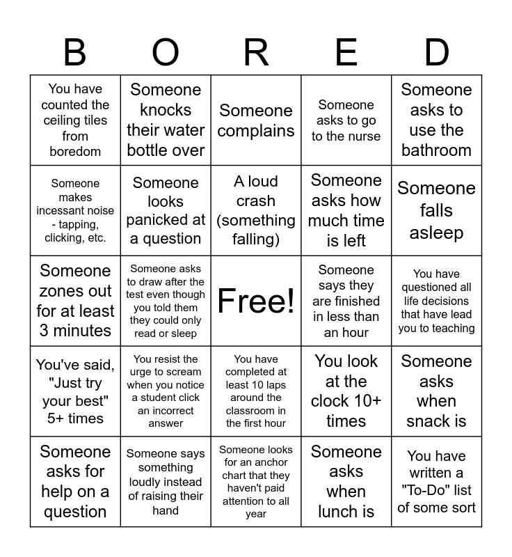 This bingo card has a free space and 24 words: You resist the urge to scream when you notice a student click an incorrect answer, Someone says something loudly instead of raising their hand, A loud crash (something falling), Someone asks for help on a question, Someone asks to use the bathroom, You have counted the ceiling tiles from boredom, Someone makes incessant noise - tapping, clicking, etc., Someone knocks their water bottle over, Someone says they are finished in less than an hour, You have completed at least 10 laps around the classroom in the first hour, Someone asks how much time is left, Someone zones out for at least 3 minutes, You look at the clock 10+ times, Someone asks when snack is, Someone looks panicked at a question, Someone asks when lunch is, You have questioned all life decisions that have lead you to teaching, Someone complains, Someone falls asleep, Someone asks to draw after the test even though you told them they could only read or sleep, You have written a "To-Do" list of some sort, You've said, "Just try your best" 5+ times, Someone asks to go to the nurse and Someone looks for an anchor chart that they haven't paid attention to all year.