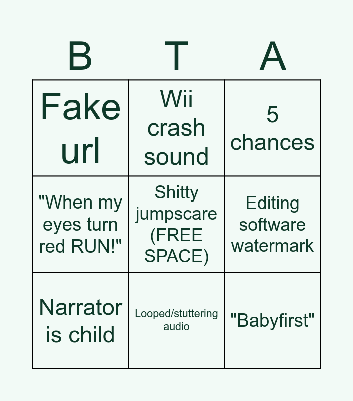 This bingo card has a free space and 18 words: i like my zeroes drippy bruh, "Where did everyone go?", 5 chances, Fake url, Stolen audio, "When my eyes turn red RUN!", Poorly edited pictures, Wii crash sound, Looped/stuttering audio, Creepypasta eyes, Subtle foreshadowing, "Babyfirst", Death is so #scary!!, Editing software watermark, Narrator is child, Narrator is tts, Good ending and Bad ending.