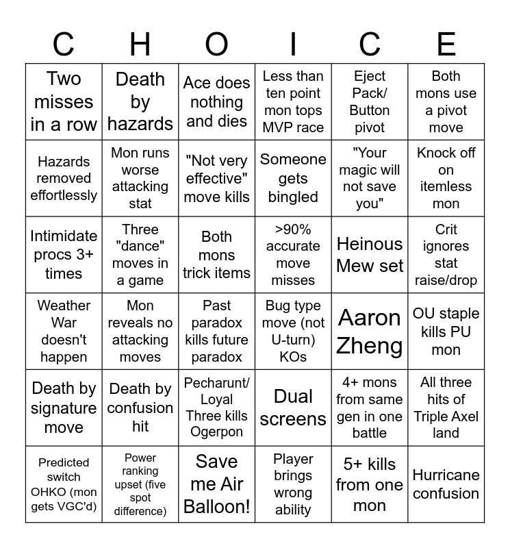 This bingo card has 36 words: Dual screens, Pecharunt/ Loyal Three kills Ogerpon, Player brings wrong ability, Hazards removed effortlessly, Weather War doesn't happen, >90% accurate move misses, Mon runs worse attacking stat, Save me Air Balloon!, Eject Pack/ Button pivot, 4+ mons from same gen in one battle, Knock off on itemless mon, Less than ten point mon tops MVP race, All three hits of Triple Axel land, Three "dance" moves in a game, Someone gets bingled, Two misses in a row, Death by signature move, Heinous Mew set, Intimidate procs 3+ times, Ace does nothing and dies, Both mons trick items, Mon reveals no attacking moves, Bug type move (not U-turn) KOs, Past paradox kills future paradox, Aaron Zheng, Death by hazards, "Your magic will not save you", Power ranking upset (five spot difference), "Not very effective" move kills, Both mons use a pivot move, Hurricane confusion, Predicted switch OHKO (mon gets VGC'd), OU staple kills PU mon, Crit ignores stat raise/drop, Death by confusion hit and 5+ kills from one mon.