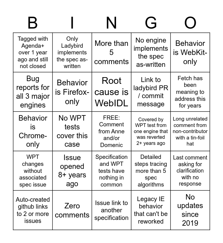 This bingo card has a free space and 24 words: Issue opened 8+ years ago, Zero comments, Root cause is WebIDL, Auto-created github links to 2 or more issues, Behavior is WebKit-only, Tagged with Agenda+ over 1 year ago and still not closed, Bug reports for all 3 major engines, Only Ladybird implements the spec as-written, Covered by WPT test from one engine that was reverted 2+ years ago, Specification and WPT tests have nothing in common, Link to ladybird PR / commit message, Behavior is Chrome-only, Detailed steps tracing more than 5 spec algorithms, Last comment asking for clarification with no response, Behavior is Firefox-only, Legacy IE behavior that can't be reworked, Long unrelated comment from non-contributor with a tin-foil hat, More than 5 comments, Fetch has been meaning to address this for years, No WPT tests cover this case, No updates since 2019, WPT changes without associated spec issue, No engine implements the spec as-written and Issue link to another specification.
