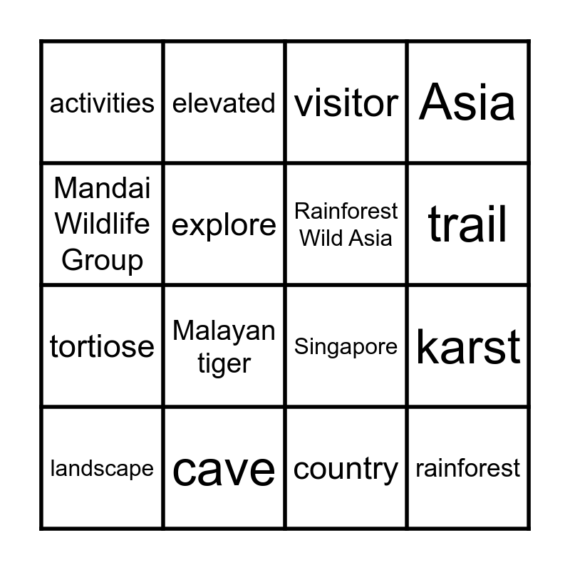 This bingo card has 20 words: karst, species, visitor, wildlife adventure park, landscape, Mandai Wildlife Group, cave, activities, tortiose, elevated, Malayan tiger, Singapore, explore, rainforest, Rainforest Wild Asia, waterfall, trail, Asia, country and animals.