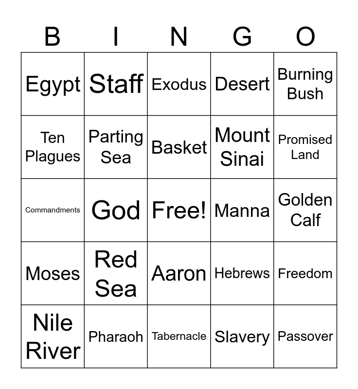 This bingo card has a free space and 24 words: Red Sea, Pharaoh, Basket, Nile River, Burning Bush, Egypt, Ten Plagues, Staff, Manna, Aaron, Mount Sinai, Commandments, Hebrews, Freedom, Parting Sea, Slavery, Golden Calf, Exodus, Promised Land, God, Passover, Moses, Desert and Tabernacle.