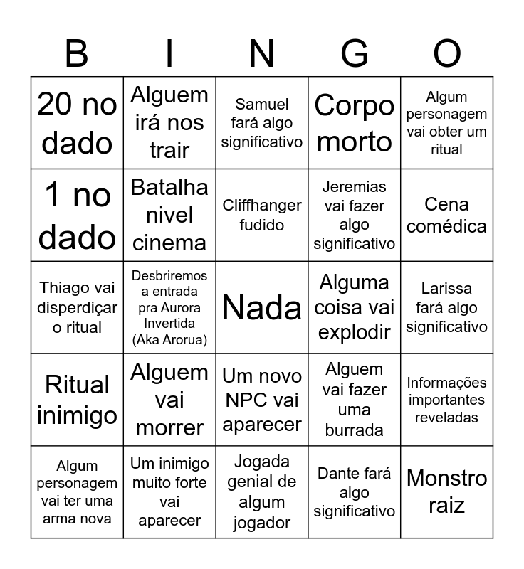 This bingo card has a free space and 24 words: Alguem vai morrer, Um inimigo muito forte vai aparecer, Cliffhanger fudido, Algum personagem vai ter uma arma nova, Algum personagem vai obter um ritual, 20 no dado, 1 no dado, Alguem irá nos trair, Alguma coisa vai explodir, Um novo NPC vai aparecer, Jeremias vai fazer algo significativo, Thiago vai disperdiçar o ritual, Alguem vai fazer uma burrada, Informações importantes reveladas, Batalha nivel cinema, Dante fará algo significativo, Larissa fará algo significativo, Samuel fará algo significativo, Cena comédica, Desbriremos a entrada pra Aurora Invertida (Aka Arorua), Monstro raiz, Ritual inimigo, Corpo morto and Jogada genial de algum jogador.