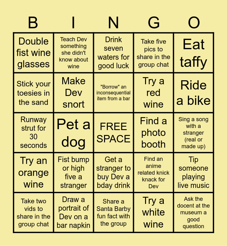 This bingo card has a free space and 24 words: Fist bump or high five a stranger, Draw a portrait of Dev on a bar napkin, "Borrow" an inconsequential item from a bar, Take two vids to share in the group chat, Eat taffy, Double fist wine glasses, Stick your toesies in the sand, Teach Dev something she didn't know about wine, Find a photo booth, Get a stranger to buy Dev a bday drink, Try a red wine, Runway strut for 30 seconds, Find an anime related knick knack for Dev, Tip someone playing live music, Make Dev snort, Try a white wine, Sing a song with a stranger (real or made up), Drink seven waters for good luck, Ride a bike, Pet a dog, Ask the docent at the museum a good question, Try an orange wine, Take five pics to share in the group chat and Share a Santa Barby fun fact with the group.