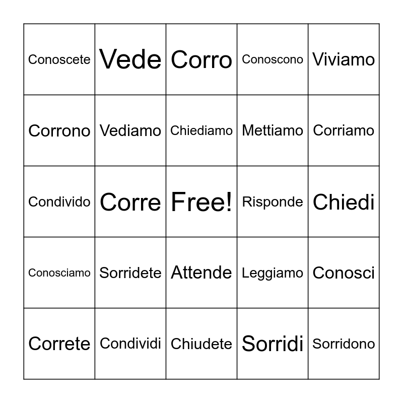 This bingo card has a free space and 90 words: Attendo, Attendi, Attende, Attendiamo, Attendete, Attendono, Bevo, Bevi, Beve, Beviamo, Bevete, Bevono, Chiedo, Chiedi, Chiede, Chiediamo, Chiedete, Chiedono, Chiudo, Chiudi, Chiude, Chiudiamo, Chiudete, Chiudono, Condivido, Condividi, Condivide, Condividiamo, Condividete, Condividono, Conosco, Conosci, Conosce, Conosciamo, Conoscete, Conoscono, Corro, Corri, Corre, Corriamo, Correte, Corrono, Leggo, Leggi, Legge, Leggiamo, Leggete, Leggono, Metto, Metti, Mette, Mettiamo, Mettete, Mettono, Rispondo, Rispondi, Risponde, Rispondiamo, Rispondete, Rispondono, Scrivo, Scrivi, Scrive, Scriviamo, Scrivete, Scrivono, Sorrido, Sorridi, Sorride, Sorridiamo, Sorridete, Sorridono, Vedo, Vedi, Vede, Vediamo, Vedete, Vedono, Vivo, Vivi, Vive, Viviamo, Vivete, Vivono, Vinco, Vinci, Vince, Vinciamo, Vincete and Vincono.