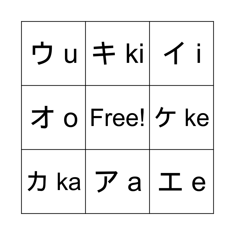 This bingo card has a free space and 10 words: ア a, イ i, ウ u, エ e, オ o, カ ka, キ ki, ク ku, ケ ke and コ ko.