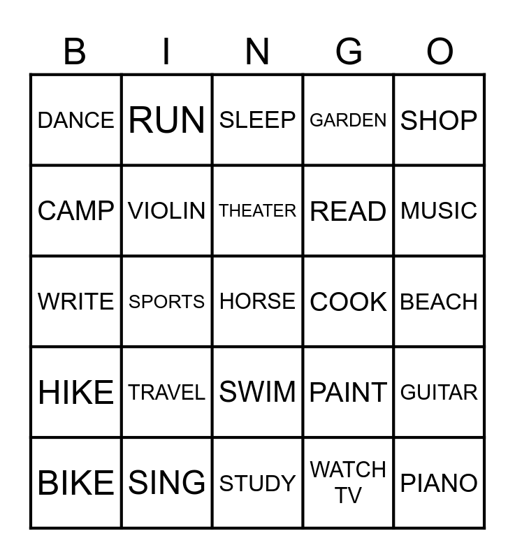 This bingo card has a free space and 24 words: TRAVEL, SING, THEATER, BIKE, SHOP, DANCE, CAMP, RUN, COOK, SWIM, READ, WRITE, PAINT, GUITAR, VIOLIN, WATCH TV, BEACH, SLEEP, MUSIC, SPORTS, PIANO, HIKE, GARDEN and STUDY.
