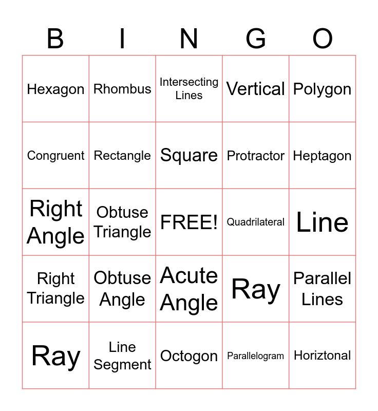 This bingo card has a free space and 32 words: Parallelogram, Triangle, Obtuse Triangle, Acute Triangle, Right Triangle, Rectangle, Polygon, Parallel Lines, Rhombus, Vertices, Square, Intersecting Lines, Trapezoid, Perpendicular Lines, Quadrilateral, Straight Angle, Ray, Right Angle, Acute Angle, Obtuse Angle, Ray, Point, Line, Line Segment, Horiztonal, Vertical, Protractor, Congruent, Hexagon, Octogon, Decagon and Heptagon.