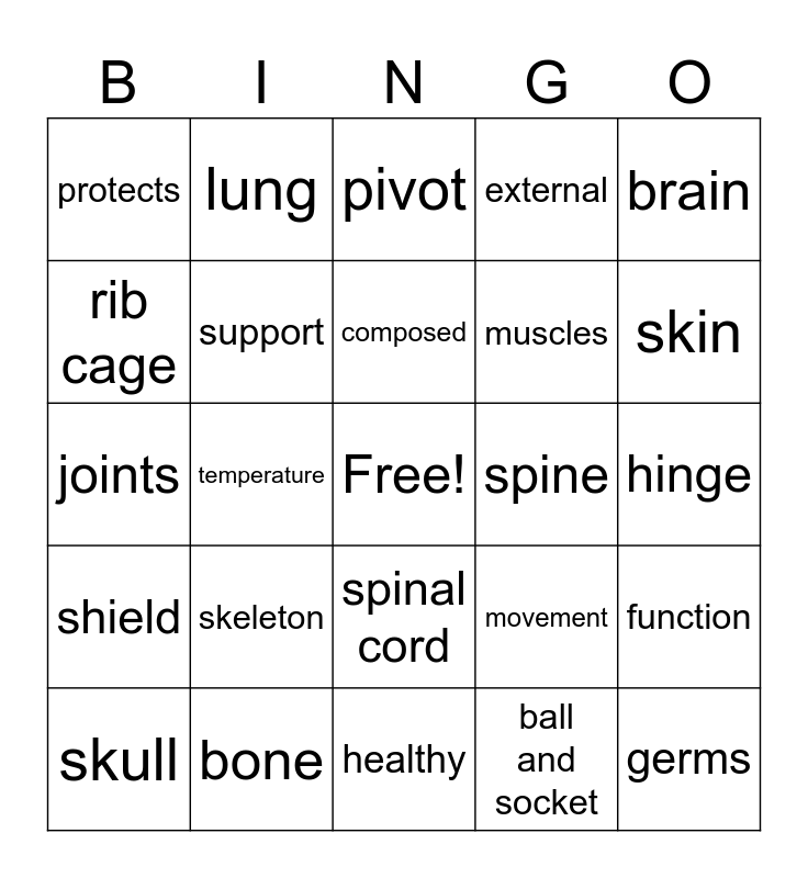 This bingo card has a free space and 24 words: skeleton, bone, composed, skull, brain, protects, rib cage, lung, spine, spinal cord, muscles, joints, movement, function, support, ball and socket, hinge, pivot, skin, temperature, germs, shield, external and healthy.