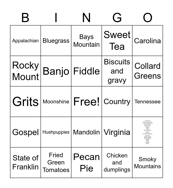 This bingo card has a free space and 28 words: Cornbread Biscuits and gravy Chicken and dumplings Rocky Mount Bays Mountain Bluegrass Gospel Country State of Franklin Grits Sweet Tea Fried Green Tomatoes Pecan Pie Collard Greens Barbecue (BBQ) Hushpuppies Banjo Fiddle Mandolin Appal, Cornbread, Biscuits and gravy, Chicken and dumplings, Rocky Mount, Bays Mountain, Bluegrass, Gospel, Country, State of Franklin, Grits, Sweet Tea, Fried Green Tomatoes, Pecan Pie, Collard Greens, Barbecue (BBQ), Hushpuppies, Banjo, Fiddle, Mandolin, Appalachian, Harmony, Smoky Mountains, Moonshine, Tennessee, Virginia, Carolina and Appalachia.