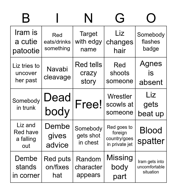 This bingo card has a free space and 24 words: Dembe gives advice, Red puts on/fixes hat, Red tells crazy story, Dembe stands in corner, Somebody flashes badge, Iram is a cutie patootie, Liz tries to uncover her past, Red eats/drinks something, Wrestler scowls at someone, Somebody gets shot in chest, Red shoots someone, Somebody in trunk, Red goes to foreign country/goes in private jet, Blood spatter, Navabi cleavage, Missing body part, Liz gets beat up, Target with edgy name, Agnes is absent, Dead body, Iram gets into uncomfortable situation, Liz and Red have a falling out, Liz changes hair and Random character appears.