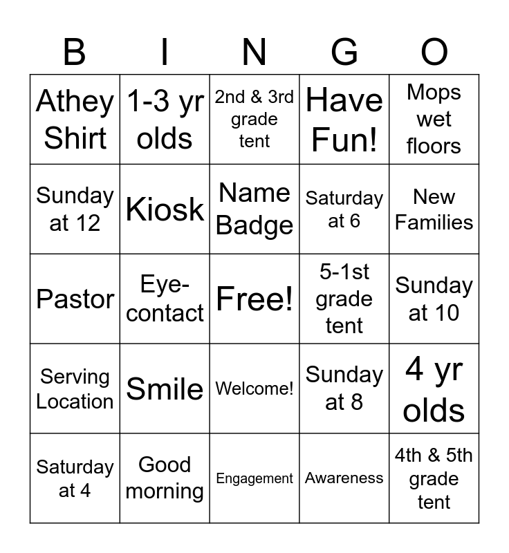 This bingo card has a free space and 24 words: Smile, Good morning, Name Badge, Saturday at 4, Mops wet floors, Athey Shirt, Sunday at 12, 1-3 yr olds, 5-1st grade tent, Welcome!, Saturday at 6, Pastor, Sunday at 8, 4 yr olds, Kiosk, Awareness, Sunday at 10, 2nd & 3rd grade tent, New Families, Eye-contact, 4th & 5th grade tent, Serving Location, Have Fun! and Engagement.