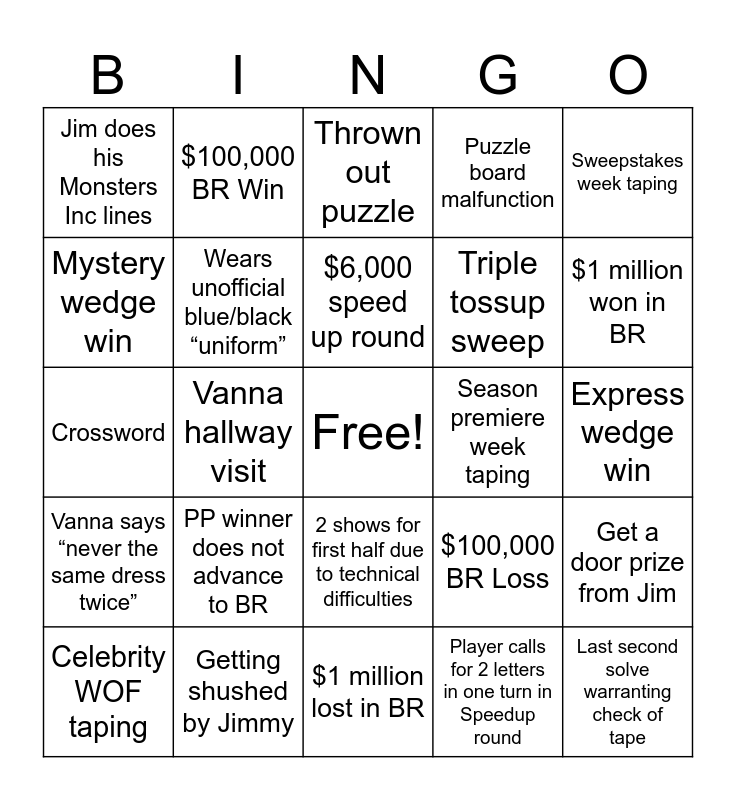 This bingo card has a free space and 24 words: PP winner does not advance to BR, Getting shushed by Jimmy, $6,000 speed up round, Celebrity WOF taping, Sweepstakes week taping, Jim does his Monsters Inc lines, Mystery wedge win, $100,000 BR Win, Season premiere week taping, 2 shows for first half due to technical difficulties, Triple tossup sweep, Crossword, $100,000 BR Loss, Get a door prize from Jim, Wears unofficial blue/black “uniform”, Player calls for 2 letters in one turn in Speedup round, Express wedge win, Thrown out puzzle, $1 million won in BR, Vanna hallway visit, Last second solve warranting check of tape, Vanna says “never the same dress twice”, Puzzle board malfunction and $1 million lost in BR.