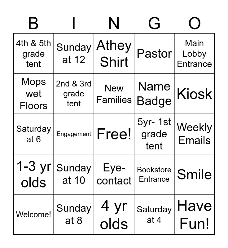 This bingo card has a free space and 28 words: Smile, Good morning, Name Badge, Saturday at 4, Mops wet Floors, Athey Shirt, Sunday at 12, 1-3 yr olds, 5yr- 1st grade tent, Welcome!, Saturday at 6, Pastor, Sunday at 8, 4 yr olds, Kiosk, Awareness, Sunday at 10, 2nd & 3rd grade tent, New Families, Eye-contact, 4th & 5th grade tent, Serving Location, Have Fun!, Engagement, Weekly Emails, Bookstore Entrance, Main Lobby Entrance and Lower Level Entrance.