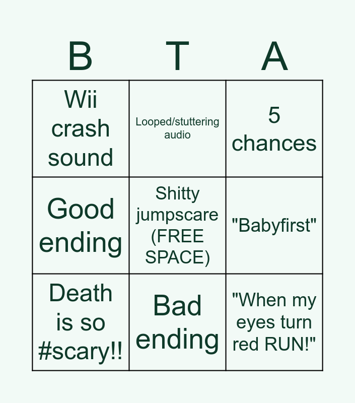 This bingo card has a free space and 19 words: i like my zeroes drippy bruh, "Where did everyone go?", 5 chances, Fake url, Stolen audio, "When my eyes turn red RUN!", Poorly edited pictures, Wii crash sound, Looped/stuttering audio, Creepypasta eyes, Subtle foreshadowing, "Babyfirst", Death is so #scary!!, Editing software watermark, Narrator is child, Narrator is tts, Good ending, Bad ending and "Turn off your tv now".