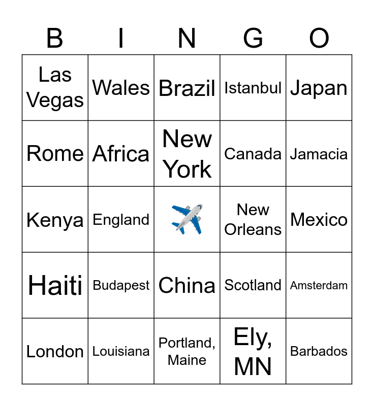 This bingo card has a free space and 27 words: Scotland, Guadalajara, Canada, Portland, Maine, Rome, Brazil, Wales, Haiti, New Orleans, Amsterdam, Kenya, Istanbul, London, Louisiana, Jamacia, Rio, Africa, New York, Budapest, Las Vegas, Mexico, Ely, MN, England, Barbados, China, Japan and India.