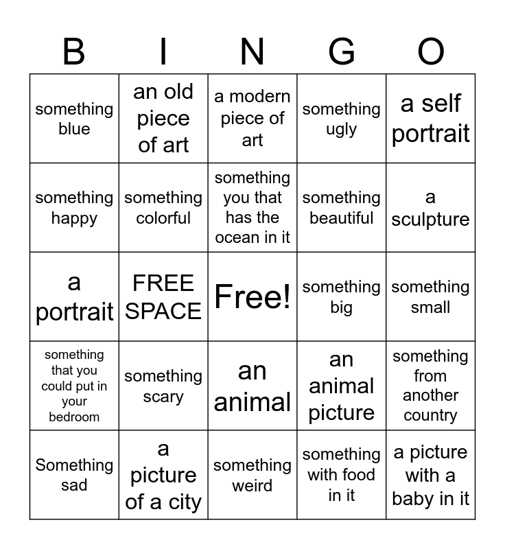 This bingo card has a free space and 29 words: Something sad, A photograph, FREE SPACE, A picture of a group of people, something blue, a modern piece of art, something colorful, something scary, something big, a picture of a city, something small, a picture with a baby in it, something weird, something with food in it, a sculpture, a landscape, an animal, something that you could put in your bedroom, a self portrait, a portrait, an animal picture, something tall, something beautiful, something happy, something ugly, an old piece of art, something from another country, something you that has the ocean in it and something from Indiana.