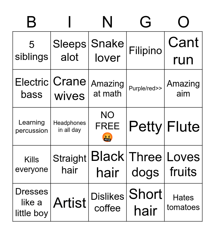 This bingo card has a free space and 24 words: Straight hair, Artist, Amazing at math, Dresses like a little boy, Cant run, 5 siblings, Electric bass, Sleeps alot, Petty, Black hair, Purple/red>>, Learning percussion, Three dogs, Loves fruits, Crane wives, Short hair, Flute, Snake lover, Amazing aim, Headphones in all day, Hates tomatoes, Kills everyone, Filipino and Dislikes coffee.