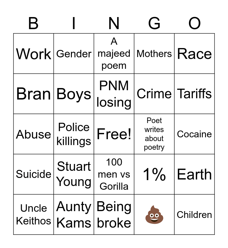 This bingo card has a free space and 24 words: Stuart Young, Aunty Kams, PNM losing, Uncle Keithos, Race, Work, Bran, Gender, Poet writes about poetry, 100 men vs Gorilla, Crime, Abuse, 1%, Earth, Boys, 💩, Cocaine, A majeed poem, Tariffs, Police killings, Children, Suicide, Mothers and Being broke.