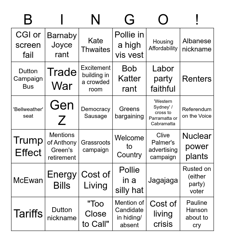 This bingo card has 48 words: Everyday Australians, 'Bellweather' seat, China, Clive Palmer's advertising campaign, 'Western Sydney' / cross to Parramatta or Cabramatta, Pollie in a silly hat, Barnaby Joyce rant, Cross to Bega, Albanese nickname, Dutton nickname, Dutton Campaign Bus, Pollie in a high vis vest, Mentions of Anthony Green's retirement, Trump Effect, Pauline Hanson about to cry, Cost of Living, Trade War, Gen Z, "Long night ahead of us", Housing Affordability, Renters, Nuclear power plants, CGI or screen fail, Excitement building in a crowded room, Boosting Medicare, Bob Katter rant, Grassroots campaign, ELECTION BATTLEGROUND, Referendum on the Voice, Greens bargaining, Teals bargaining, Energy Bills, Cost of living crisis, Presenter tells Labor /Liberal identity to settle down, Welcome to Country, "Too Close to Call", Mention of Candidate in hiding/ absent, Democracy Sausage, Tariffs, "The swing is on", Jagajaga, McEwan, Kate Thwaites, Corflute drama, Labor party faithful, Liberal party faithful, Rusted on (either party) voter and Mining sector.