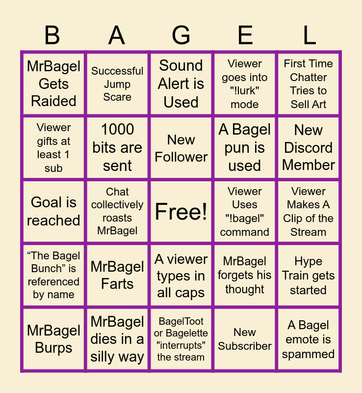 This bingo card has a free space and 24 words: MrBagel Burps, MrBagel Farts, New Follower, New Subscriber, First Time Chatter Tries to Sell Art, MrBagel Gets Raided, Successful Jump Scare, Sound Alert is Used, Viewer Uses "!bagel" command, Viewer Makes A Clip of the Stream, Goal is reached, 1000 bits are sent, MrBagel forgets his thought, Hype Train gets started, Viewer gifts at least 1 sub, MrBagel dies in a silly way, BagelToot or Bagelette "interrupts" the stream, Viewer goes into "!lurk" mode, New Discord Member, “The Bagel Bunch” is referenced by name, Chat collectively roasts MrBagel, A viewer types in all caps, A Bagel pun is used and A Bagel emote is spammed.