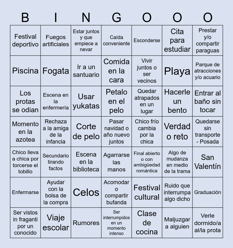 This bingo card has a free space and 48 words: Festival cultural, Playa, Ser interrumpidos en un momento intenso, Rechaza a la amiga de la infancia, Usar yukatas, Quedarse sin transporte - Posada, Fuegos artificiales, Viaje escolar, Cita para estudiar, Agarrarse las manos, Prestar y/o compartir paraguas, Caída conveniente, Hacerle un bento, Quedar atrapados en un lugar, Enfermarse, Verdad o reto, Piscina, Parque de atracciones y/o acuario, Ruido que interrumpa algo dicho, Esconderse, Vivir juntos o ser vecinos, Corte de pelo, Festival deportivo, Fogata, Graduación, Ir a un santuario, Entrar al baño sin tocar, Ser vistos in fraganti por un conocido, Petalo en el pelo, Escena en la enfermería, Maljuzgar a alguien, Chico frío cambia por la chica, San Valentín, Ayudar con la bolsa de la compra, Momento en la azotea, Final abierto o con ambigüedad romántica, Algo de mudanza en medio de la trama, Los protas se odian, Escena en la biblioteca, Celos, Chico lleva a chica por torcerse el tobillo, Verle dormido/a al/la prota, Estar juntos y que empiece a nevar, Rumores, Comida en la cara, Acomodar o compartir bufanda, Secundario tirando factos and Clase de cocina.
