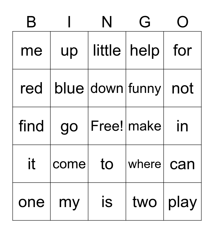 This bingo card has a free space and 38 words: and, away, you, blue, can, come, down, yellow, for, funny, go, help, play, in, red, it, jump, little, look, make, me, my, not, one, here, is, run, said, see, the, three, to, two, up, we, where, find and big.