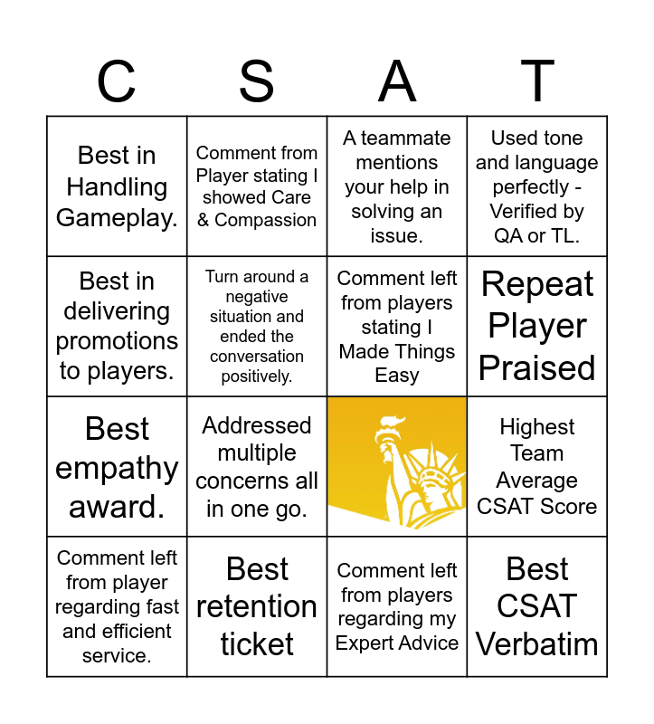This bingo card has 1 images and 15 words: Comment left from player regarding fast and efficient service., Best retention ticket, A teammate mentions your help in solving an issue., Used tone and language perfectly - Verified by QA or TL., Best in delivering promotions to players., Comment from Player stating I showed Care & Compassion, Highest Team Average CSAT Score, Best in Handling Gameplay., Turn around a negative situation and ended the conversation positively., Comment left from players regarding my Expert Advice, Repeat Player Praised, Best empathy award., Addressed multiple concerns all in one go., Comment left from players stating I Made Things Easy and Best CSAT Verbatim.