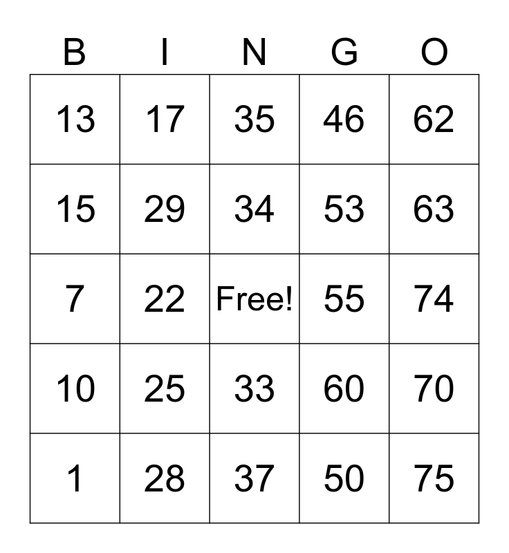This bingo card has a free space and 24 words: 1, 25, 34, 50, 62, 13, 17, 35, 55, 74, 7, 29, 60, 70, 15, 28, 37, 46, 63, 10, 22, 33, 53 and 75.