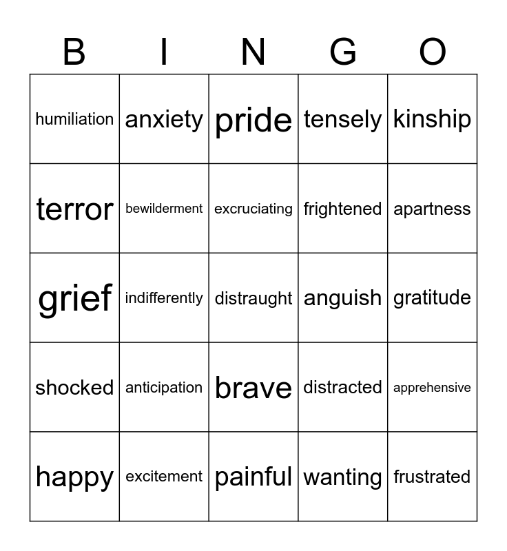This bingo card has a free space and 24 words: anticipation, excitement, excruciating, happy, kinship, humiliation, terror, anxiety, anguish, brave, frightened, grief, distracted, apprehensive, bewilderment, wanting, gratitude, pride, apartness, indifferently, frustrated, shocked, tensely and painful.