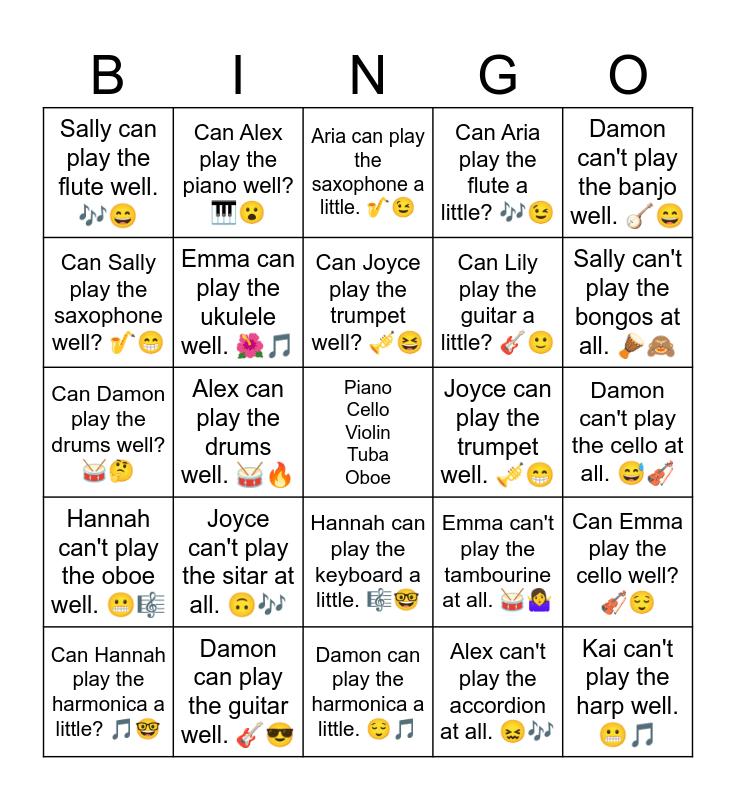 This bingo card has a free space and 30 words: Damon can play the guitar well. 🎸😎, Kai can play the piano a little. 🎹🙂, Alex can play the drums well. 🥁🔥, Lily can play the violin a little. 🎻😊, Sally can play the flute well. 🎶😄, Aria can play the saxophone a little. 🎷😉, Emma can play the ukulele well. 🌺🎵, Hannah can play the keyboard a little. 🎼🤓, Joyce can play the trumpet well. 🎺😁, Damon can play the harmonica a little. 😌🎵, Damon can't play the cello at all. 😅🎻, Kai can't play the harp well. 😬🎵, Alex can't play the accordion at all. 😖🎶, Lily can't play the electric guitar well. 🎸😕, Sally can't play the bongos at all. 🪘🙈, Aria can't play the clarinet well. 🎶😓, Emma can't play the tambourine at all. 🥁🤷♀️, Hannah can't play the oboe well. 😬🎼, Joyce can't play the sitar at all. 🙃🎶, Damon can't play the banjo well. 🪕😄, Can Damon play the drums well? 🥁🤔, Can Kai play the violin a little? 🎻🧐, Can Alex play the piano well? 🎹😮, Can Lily play the guitar a little? 🎸🙂, Can Sally play the saxophone well? 🎷😁, Can Aria play the flute a little? 🎶😉, Can Emma play the cello well? 🎻😌, Can Hannah play the harmonica a little? 🎵🤓, Can Joyce play the trumpet well? 🎺😆 and Can Damon play the ukulele a little? 🌺🎶.