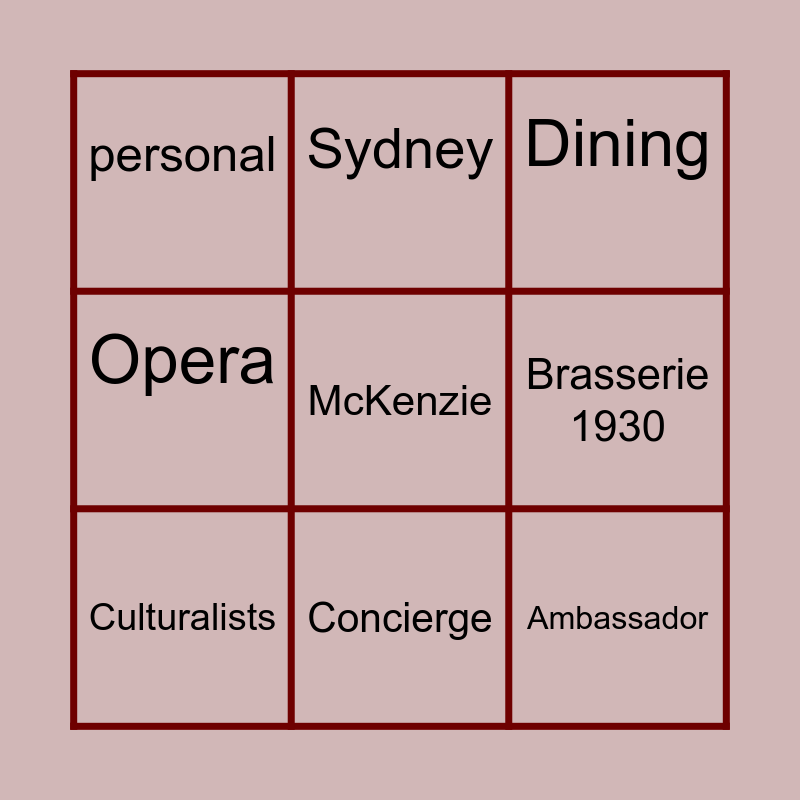 This bingo card has 18 words: Luxury, Service, Dining, personal, Forbes, Opera, Sandstone, Sydney, Concierge, Ambassador, Stars, McKenzie, Smith, Brasserie 1930, Culturalists, Service, Bridge and Dining.