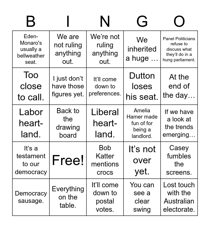 This bingo card has a free space and 25 words: Free!, It’ll come down to postal votes., It’ll come down to preferences., Democracy sausage., Panel Politicians refuse to discuss what they’ll do in a hung parliament., Eden-Monaro's usually a bellweather seat., Too close to call., We are not ruling anything out., Amelia Hamer made fun of for being a landlord., Bob Katter mentions crocs, Dutton loses his seat., Labor heart-land., It’s not over yet., Casey fumbles the screens., I just don’t have those figures yet., In an era of global insecurity…, If we have a look at the trends emerging…, We’re not ruling anything out., At the end of the day…, Back to the drawing board, Lost touch with the Australian electorate., Everything on the table., It’s a testament to our democracy, We inherited a huge … and You can see a clear swing.