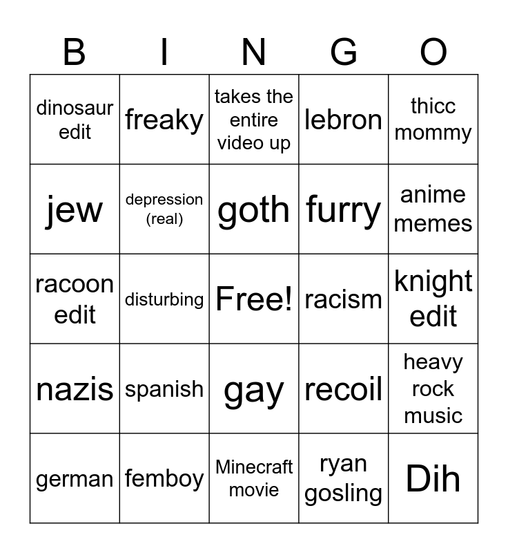 This bingo card has a free space and 24 words: spanish, femboy, goth, german, thicc mommy, dinosaur edit, jew, freaky, racism, gay, furry, racoon edit, recoil, heavy rock music, depression (real), ryan gosling, knight edit, takes the entire video up, anime memes, disturbing, Dih, nazis, lebron and Minecraft movie.