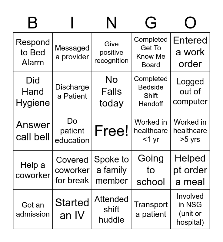 This bingo card has a free space and 24 words: Covered coworker for break, Started an IV, No Falls today, Got an admission, Entered a work order, Respond to Bed Alarm, Did Hand Hygiene, Messaged a provider, Worked in healthcare <1 yr, Spoke to a family member, Completed Bedside Shift Handoff, Answer call bell, Going to school, Helped pt order a meal, Discharge a Patient, Transport a patient, Worked in healthcare >5 yrs, Give positive recognition, Logged out of computer, Do patient education, Involved in NSG (unit or hospital), Help a coworker, Completed Get To Know Me Board and Attended shift huddle.
