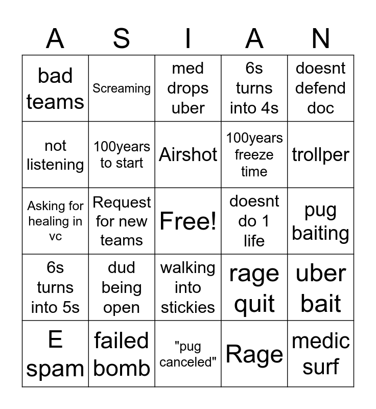 This bingo card has a free space and 24 words: dud being open, failed bomb, Airshot, E spam, doesnt defend doc, bad teams, not listening, Screaming, doesnt do 1 life, walking into stickies, 100years freeze time, Asking for healing in vc, rage quit, uber bait, 100years to start, Rage, pug baiting, med drops uber, trollper, Request for new teams, medic surf, 6s turns into 5s, 6s turns into 4s and "pug canceled".
