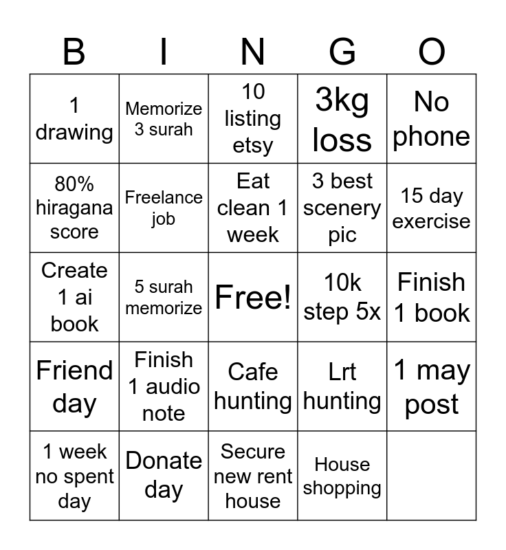 This bingo card has a free space and 24 words: Friend day, Donate day, Cafe hunting, Lrt hunting, No phone, 1 drawing, Memorize 3 surah, 10 listing etsy, 3 best scenery pic, 1 may post, 80% hiragana score, Freelance job, 1 new recepie, 10k step 5x, 15 day exercise, 1 week no spent day, 5 surah memorize, Eat clean 1 week, 3kg loss, Finish 1 book, Create 1 ai book, Finish 1 audio note, Secure new rent house and House shopping.