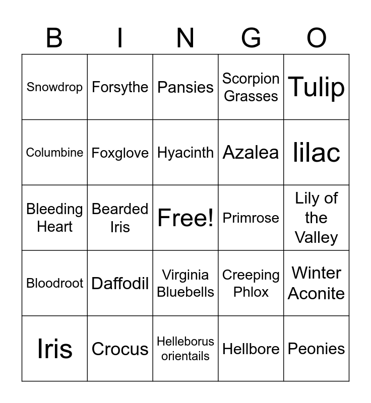 This bingo card has a free space and 24 words: Daffodil, Crocus, Hyacinth, Iris, Tulip, Snowdrop, Columbine, Forsythe, Primrose, Virginia Bluebells, Azalea, Bleeding Heart, Creeping Phlox, Winter Aconite, Foxglove, Hellbore, Lily of the Valley, Pansies, lilac, Bearded Iris, Peonies, Bloodroot, Scorpion Grasses and Helleborus orientails.