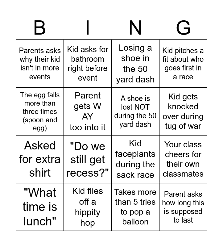 This bingo card has 16 words: Kid flies off a hippity hop, Your class cheers for their own classmates, Losing a shoe in the 50 yard dash, Parents asks why their kid isn't in more events, Asked for extra shirt, Kid asks for bathroom right before event, Kid faceplants during the sack race, Takes more than 5 tries to pop a balloon, The egg falls more than three times (spoon and egg), Parent gets WAY too into it, "What time is lunch", Kid pitches a fit about who goes first in a race, "Do we still get recess?", Kid gets knocked over during tug of war, A shoe is lost NOT during the 50 yard dash and Parent asks how long this is supposed to last.