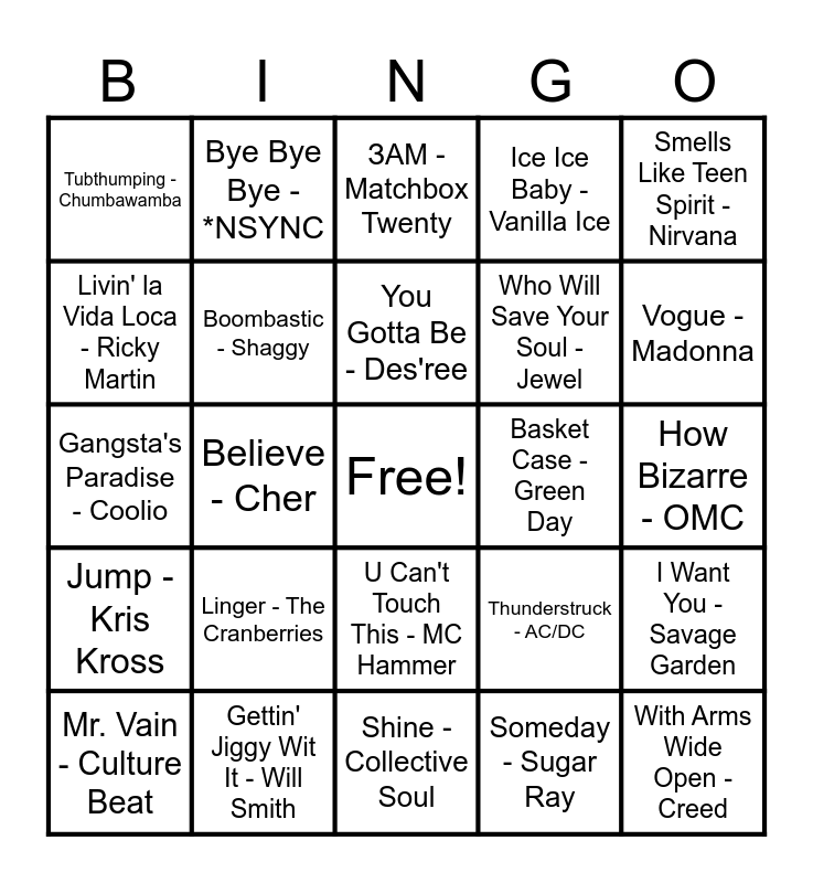This bingo card has a free space and 100 words: The Show Must Go On - Queen, All I Wanna Do - Sheryl Crow, How Bizarre - OMC, Closing Time - Semisonic, It's All Coming Back to Me Now - Céline Dion, The Distance - CAKE, Barbie Girl - Aqua, Blue - Eiffel 65, Jump Around - House Of Pain, Gonna Make You Sweat - C & C Music Factory, Losing My Religion - R.E.M., I'm Too Sexy - Right Said Fred, Free Fallin' - Tom Petty, Gettin' Jiggy Wit It - Will Smith, Mambo No. 5 - Lou Bega, Will You Be There - Michael Jackson, Who Will Save Your Soul - Jewel, All For Love - Bryan Adams, Return of the Mack - Mark Morrison, The Sign - Ace of Base, Baby Baby - Amy Grant, Life Is A Highway - Tom Cochrane, Fly Away - Lenny Kravitz, I Will Always Love You - Whitney Houston, This Is How We Do It - Montell Jordan, Basket Case - Green Day, Smells Like Teen Spirit - Nirvana, Thunderstruck - AC/DC, Everlong - Foo Fighters, What a Girl Wants - Christina Aguilera, Believe - Cher, Tubthumping - Chumbawamba, Semi-Charmed Life -Third Eye Blind, ...Baby One More Time - Britney Spears, Someday - Sugar Ray, You Gotta Be - Des'ree, I Want You - Savage Garden, Sweetness - Jimmy Eat World, Emotions - Mariah Carey, My Lovin' - En Vogue, Pretty Fly - The Offspring, Shoop - Salt-N-Pepa, Gangsta's Paradise - Coolio, 1979 - The Smashing Pumpkins, Vogue - Madonna, ЗАМ - Matchbox Twenty, Gin And Juice - Snoop Dogg, Give It Away - Red Hot Chili Peppers, Wonderwall - Oasis, Shine - Collective Soul, The Lion Sleeps Tonight - The Tokens, When I'm Up I Can't Get Down - Great Big Sea, She’s So High - Tal Bachman, I’d Do Anything For Love - Meat Loaf, Achy Breaky Heart - Billy Ray Cyrus, End Of The Road - Boyz II Men, Bad Boys - Inner Circle, Mr. Jones - Counting Crows, No Rain - Blind Melon, Ice Ice Baby - Vanilla Ice, Candle In The Wind - Elton John, Whoomp! There It Is - Tag Team, Boom Boom Boom Boom!! - Vengaboys, Insane in the Brain - Cypress Hill, Lemon Tree - Fools Garden, Kiss from a Rose - Seal, I Want It That Way - Backstreet Boys, Informer - Snow, Creep - Radiohead, Say My Name - Destiny's Child, That Don't Impress Me Much - Shania Twain, Linger - The Cranberries, Black Velvet - Alannah Myles, Steal My Sunshine - LEN, Slide - The Goo Goo Dolls, Macarena - Los Del Rio, S Club Party - S Club, Livin' la Vida Loca - Ricky Martin, Something To Talk About - Bonnie Raitt, Say You'll Be There - Spice Girls, Hand in my Pocket - Alanis Morissette, With Arms Wide Open - Creed, Baby Got Back - Sir Mix-A-Lot, U Can't Touch This - MC Hammer, The Impression That I Get - The Mighty Mighty Bosstones, Bye Bye Bye - *NSYNC, Sell Out - Reel Big Fish, Just A Girl - No Doubt, Nuthin' But A "G" Thang - Dr. Dre, Jump - Kris Kross, I'm Gonna Be - The Proclaimers, No Scrubs - TLC, What Is Love - Haddaway, Mr. Vain - Culture Beat, Boombastic - Shaggy, One Week - Barenaked Ladies, Butterfly - Crazy Town, Unbelievable - EMF, Two Princes - Spin Doctors and Pump Up The Jam - Technotronic.