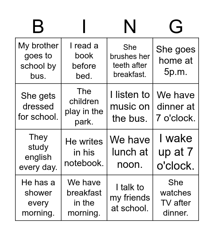This bingo card has 20 words: I wake up at 7 o'clock., He gets up quickly in the morning., She brushes her teeth after breakfast., I wash my face with cold water., He has a shower every morning., She gets dressed for school., We have breakfast in the morning., My brother goes to school by bus., They study english every day., I read a book before bed., He writes in his notebook., We have lunch at noon., The children play in the park., She watches TV after dinner., I listen to music on the bus., He does his homework in the afternoon., We have dinner at 7 o'clock., She goes home at 5p.m., I talk to my friends at school. and He goes to bed at 10 p.m..