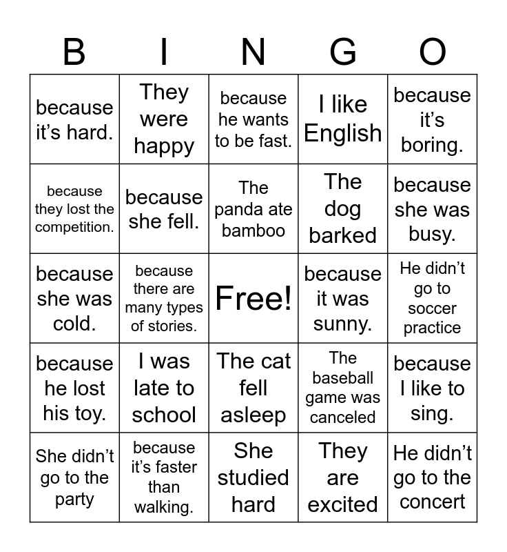 This bingo card has a free space and 24 words: I was late to school, because it’s faster than walking., The panda ate bamboo, She didn’t go to the party, because it’s boring., because it’s hard., because they lost the competition., They were happy, because it was sunny., The cat fell asleep, The dog barked, because she was cold., The baseball game was canceled, because I like to sing., because she fell., They are excited, He didn’t go to soccer practice, because he wants to be fast., because she was busy., because there are many types of stories., He didn’t go to the concert, because he lost his toy., I like English and She studied hard.