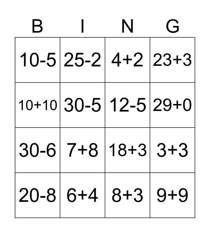 This bingo card has 30 words: 9-8, 6-4, 3+3, 7-3, 10-5, 4+2, 12-5, 16-8, 6+4, 5+4, 8+3, 20-8, 6+7, 8+6, 7+8, 20-4, 8+9, 9+9, 20-1, 10+10, 18+3, 16+6, 25-2, 30-6, 30-5, 23+3, 20+7, 29-1, 29+0 and 10+10+10.