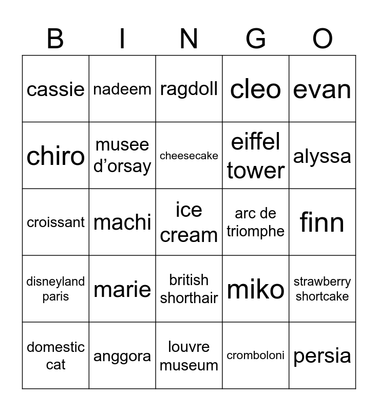 This bingo card has 25 words: marie, louvre museum, cheesecake, domestic cat, evan, cassie, chiro, nadeem, arc de triomphe, british shorthair, eiffel tower, croissant, miko, strawberry shortcake, musee d’orsay, persia, finn, ragdoll, alyssa, machi, ice cream, anggora, disneyland paris, cleo and cromboloni.