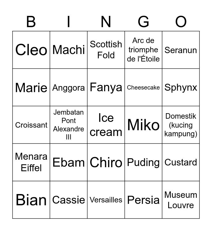 This bingo card has a free space and 24 words: Ebam, Cassie, Fanya, Bian, Seranun, Cleo, Marie, Machi, Miko, Chiro, Cheesecake, Croissant, Puding, Custard, Anggora, Persia, Domestik (kucing kampung), Scottish Fold, Sphynx, Jembatan Pont Alexandre III, Museum Louvre, Menara Eiffel, Arc de triomphe de l'Étoile and Versailles.