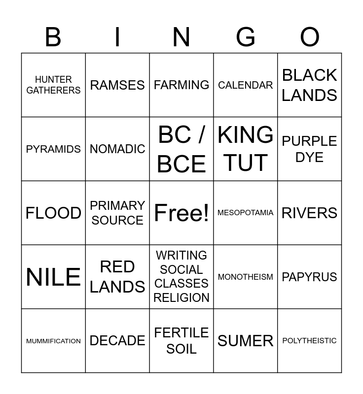 This bingo card has a free space and 30 words: DECADE, CENTURY, PRIMARY SOURCE, SECONDARY SOURCE, HUNTER GATHERERS, FARMING, NOMADIC, WRITING SOCIAL CLASSES RELIGION, MESOPOTAMIA, FERTILE SOIL, RIVERS, POLYTHEISTIC, SUMER, HAMMURABI'S CODE, PURPLE DYE, ZIGGURATS, MONOTHEISM, NILE, RED LANDS, BLACK LANDS, FLOOD, HATSHEPSUT, RAMSES, KING TUT, PYRAMIDS, CALENDAR, PAPYRUS, MUMMIFICATION, BC / BCE and AD / CE.