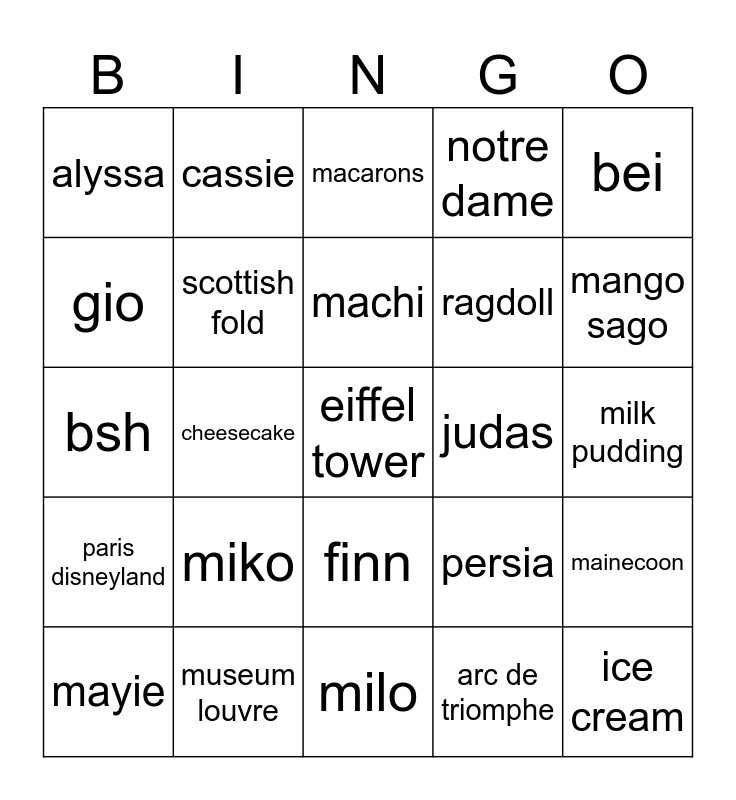 This bingo card has 25 words: miko, milo, machi, mayie, bei, alyssa, gio, cassie, judas, finn, ragdoll, bsh, persia, mainecoon, scottish fold, ice cream, milk pudding, macarons, mango sago, cheesecake, eiffel tower, museum louvre, paris disneyland, notre dame and arc de triomphe.