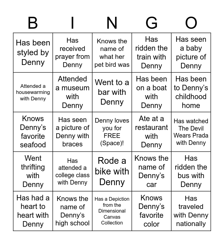 This bingo card has a free space and 48 words: Has traveled with Denny internationally, Has traveled with Denny nationally, Has a Depiction from the Wall Art Collection, Has a Depiction from the Dimensional Canvas Collection, Has attended a college class with Denny, Has attended Sunday Morning worship with Denny, Has received prayer from Denny, Has seen Denny ice skate, Attended a housewarming with Denny, Received a GifteD Defined makeup service, Attended a museum with Denny, Has ridden the train with Denny, Has ridden the bus with Denny, Knows the name of Denny’s car, Danced with Denny on a dance floor, Sang karaoke with Denny, Went to a bar with Denny, Ate at a restaurant with Denny, Received a personalized gift from Denny, Has seen a baby picture of Denny, Has seen a picture of Denny with braces, Knows Denny’s favorite color, Has been styled by Denny, Has been on a boat with Denny, Has been on a plane with Denny, Has been to Denny’s childhood home, Has had a heart to heart with Denny, Went on a hike with Denny, Rode a bike with Denny, Went thrifting with Denny, Went to a concert with Denny, Played a video game with Denny, Did something dangerous with Denny, Sang on a choir with Denny, Knows the name of Denny’s high school, Taken a fitness class with Denny, Has watched a Harry Potter movie with Denny, Has watched The Devil Wears Prada with Denny, Has watched Scandal with Denny, Has watched any of the Hangover movies with Denny, Has watched The Incredibles with Denny (1 or 2), Has watched Despicable Me with Denny, Knows the name of what her pet bird was, Knows Denny’s favorite thing to get at an Italian restaurant, Knows Denny’s favorite seafood, Know Denny’s favorite Jamaican meal, Knows Denny’s favorite makeup brand and Has gotten a pedicure with Denny.