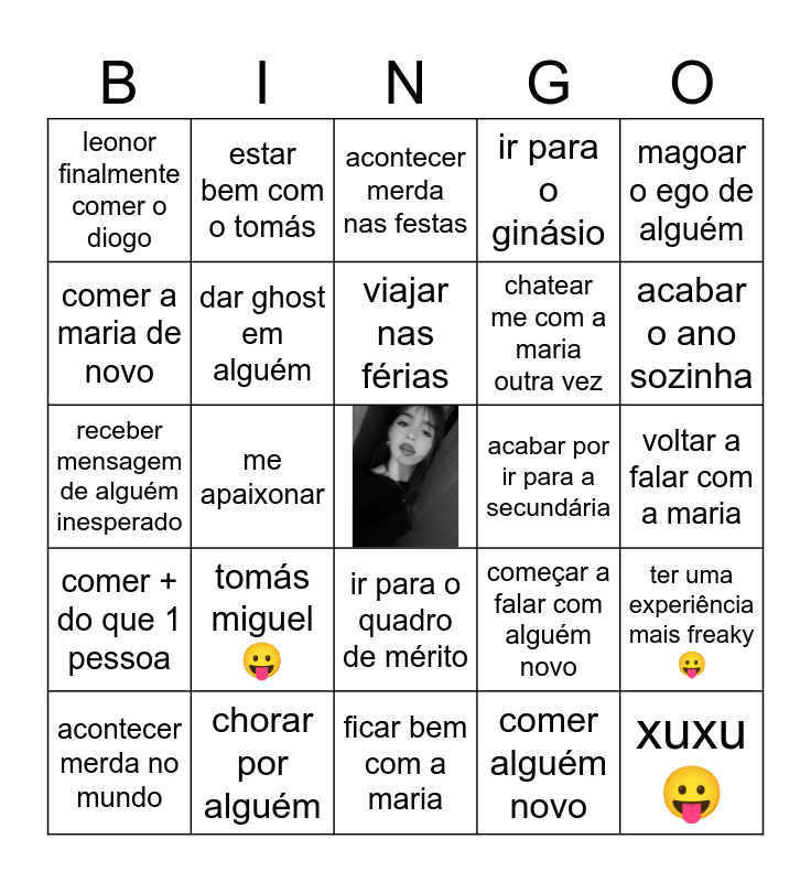 This bingo card has a free space and 24 words: tomĂĄs miguel đ, chorar por alguĂ©m, viajar nas fĂ©rias, acontecer merda no mundo, magoar o ego de alguĂ©m, leonor finalmente comer o diogo, comer a maria de novo, estar bem com o tomĂĄs, acabar por ir para a secundĂĄria, ir para o quadro de mĂ©rito, chatear me com a maria outra vez, receber mensagem de alguĂ©m inesperado, começar a falar com alguĂ©m novo, ter uma experiĂȘncia mais freaky đ, dar ghost em alguĂ©m, comer alguĂ©m novo, voltar a falar com a maria, acontecer merda nas festas, acabar o ano sozinha, me apaixonar, xuxu đ, comer + do que 1 pessoa, ir para o ginĂĄsio and ficar bem com a maria.